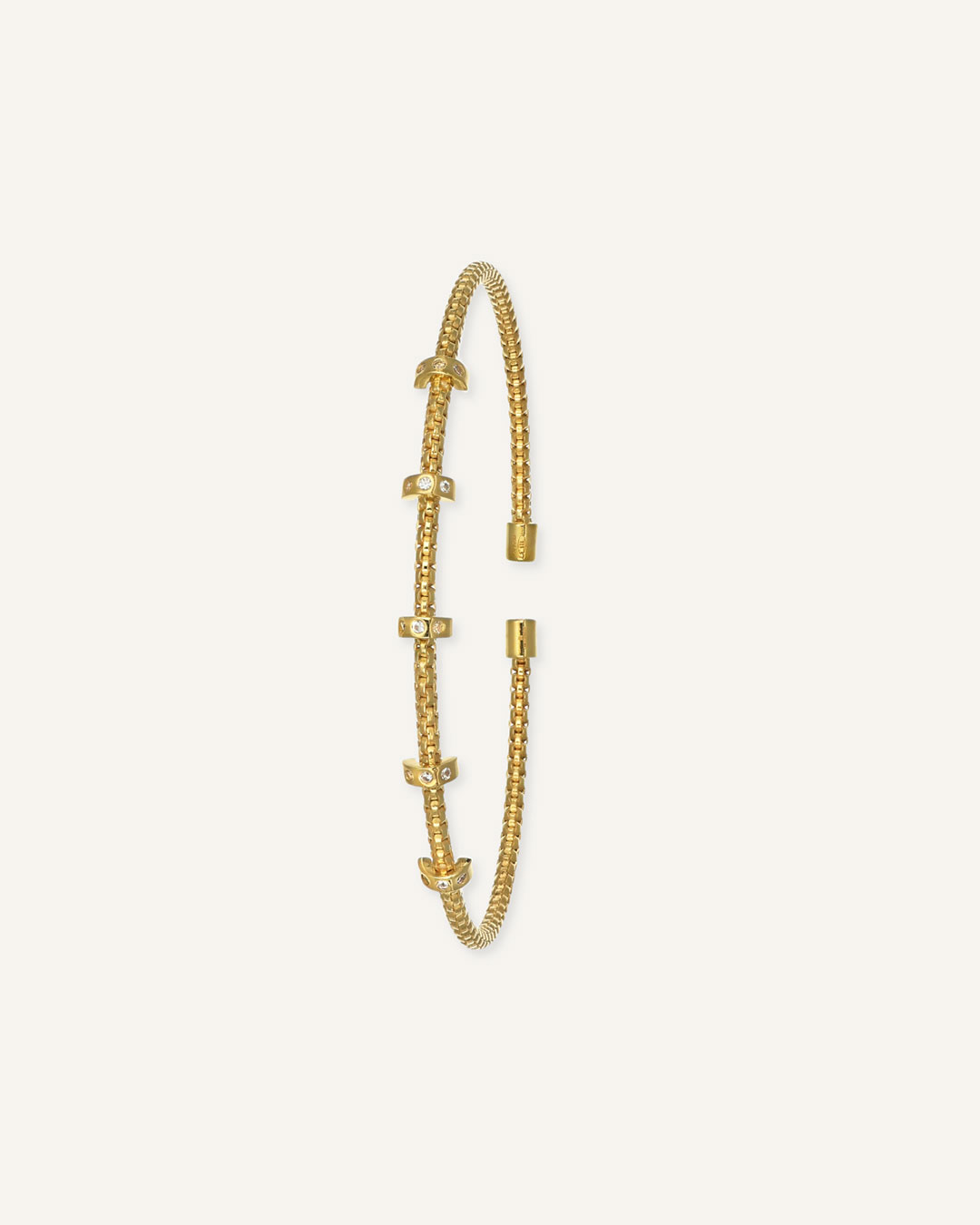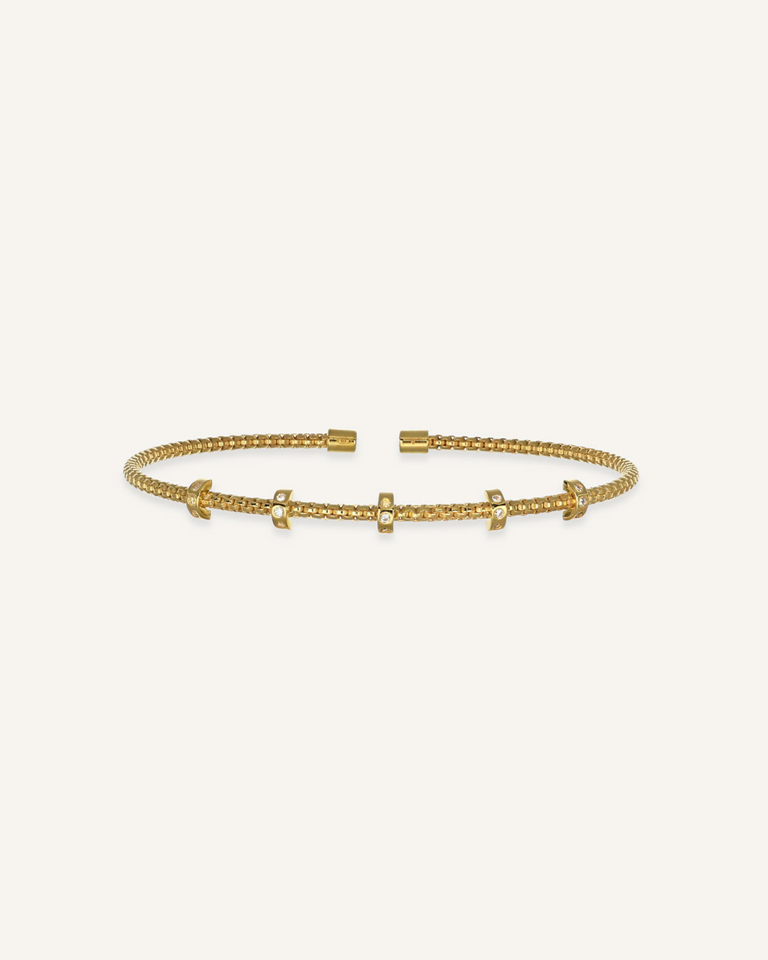 Minimalistička halka narukvica ukrašena cirkonima odiše suptilnim sjajem i elegancijom, savršena za svakodnevno nošenje ili posebne prilike. Dizajn bez kopčanja omogućuje jednostavno stavljanje i uklanjanje, pružajući praktičnost uz profinjen izgled.