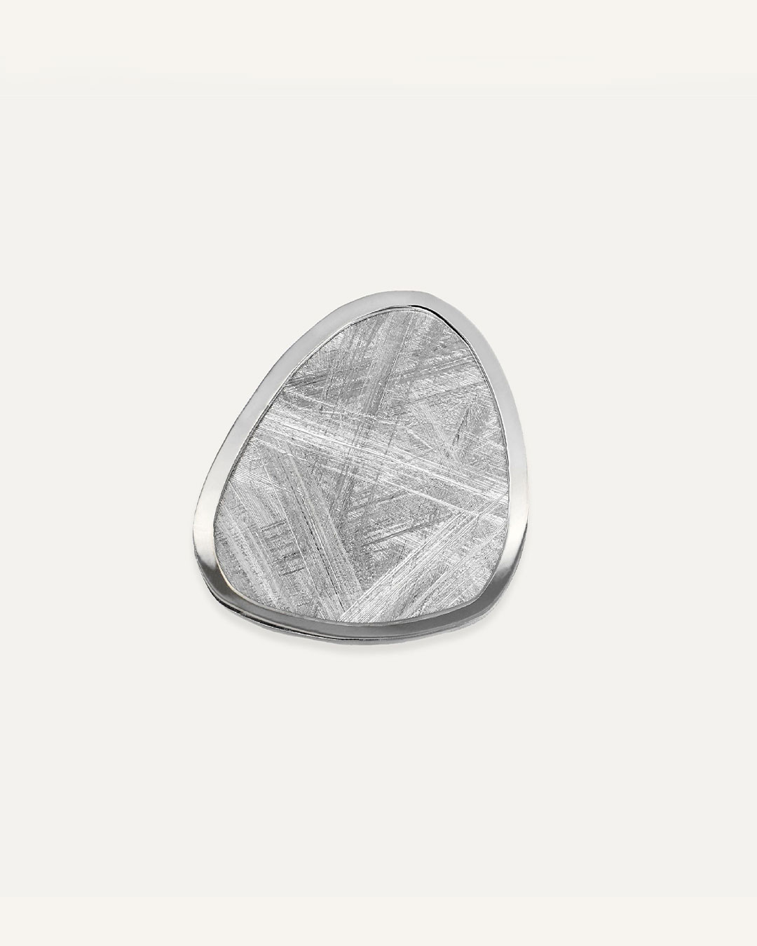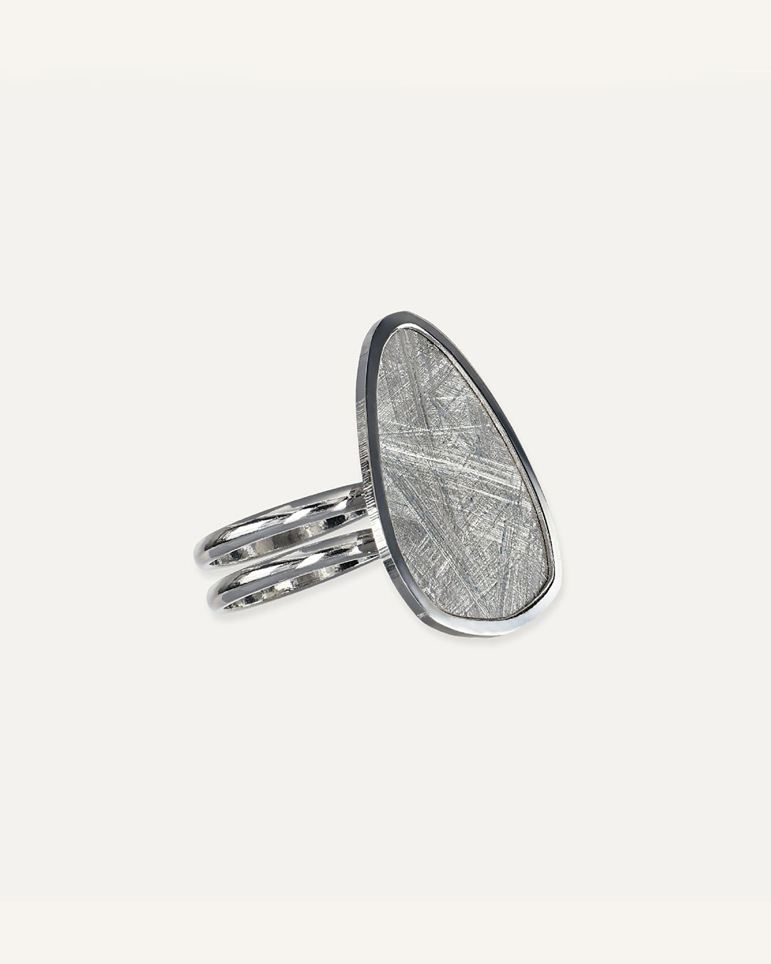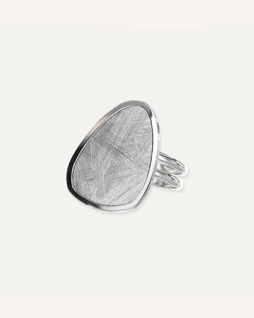 Prsten ima moderan i upečatljiv dizajn s elementom nepravilnog oblika, ukrašen teksturom koja podsjeća na gravure. Povezan je s trostrukom tankom trakom koja mu daje elegantan i sofisticiran izgled.