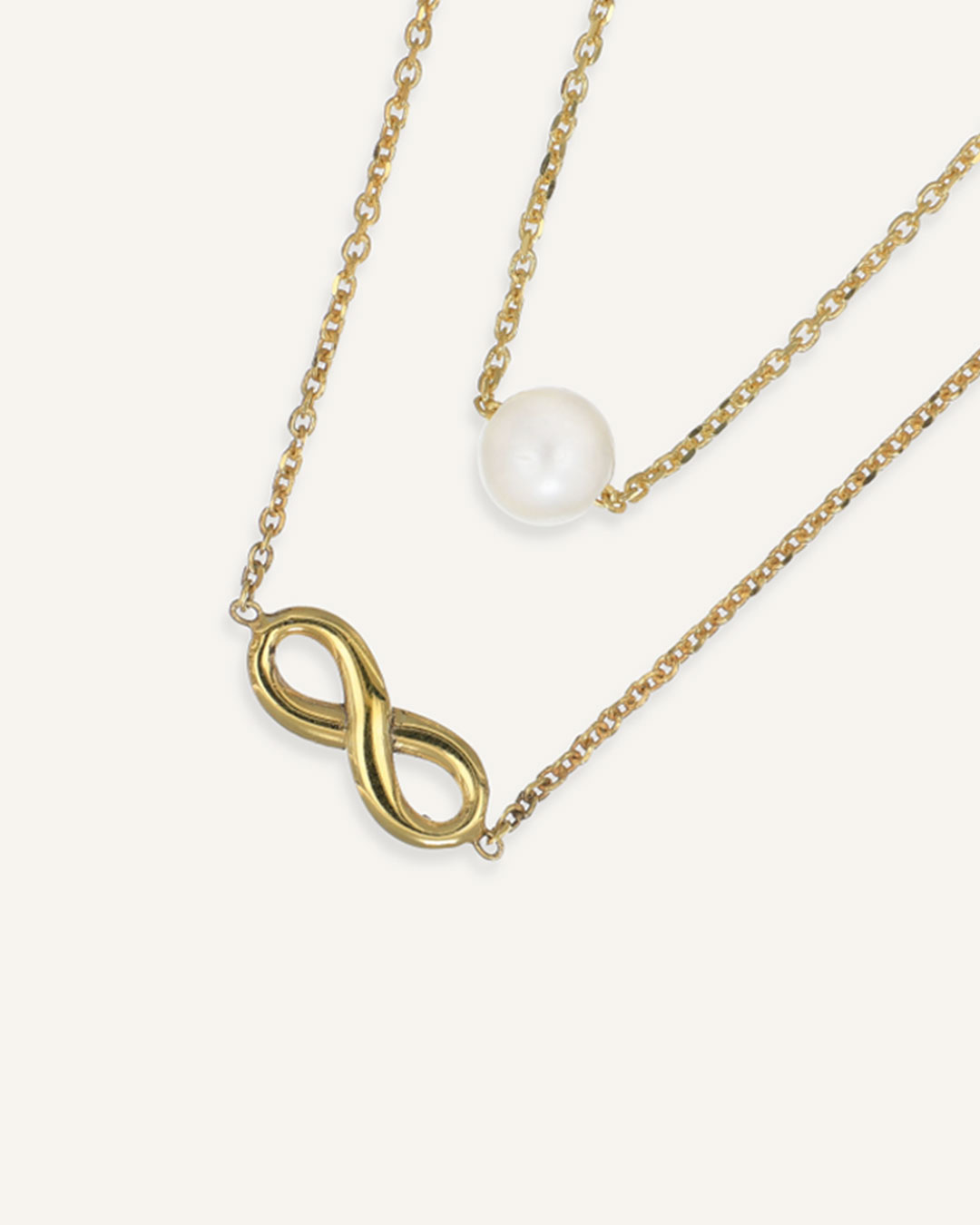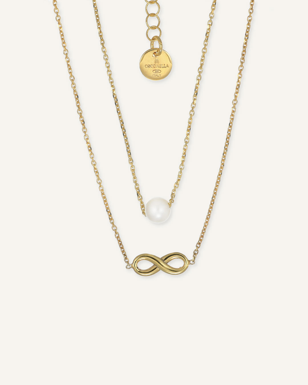 Unikatna italijanska dupla ogrlica sa infinity privjeskom i biserom donosi bezvremensku simboliku i prefinjeni dizajn. Savršena je za poklon dragim osobama, izražavajući ljubav i pažnju kroz sofisticiranost i luksuzne detalje.