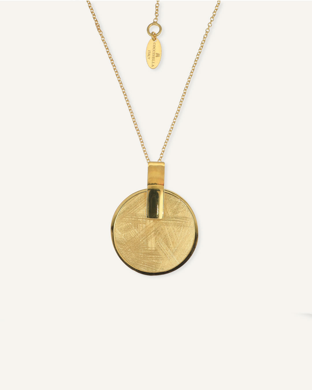 Ogrlica sa okruglim matiranim privjeskom odražava popularni italijanski industrijski stil, spajajući modernu surovost i sofisticiranu jednostavnost. Njen minimalistički dizajn čini je savršenim izborom za ljubitelje inovativnog i elegantnog izgleda.