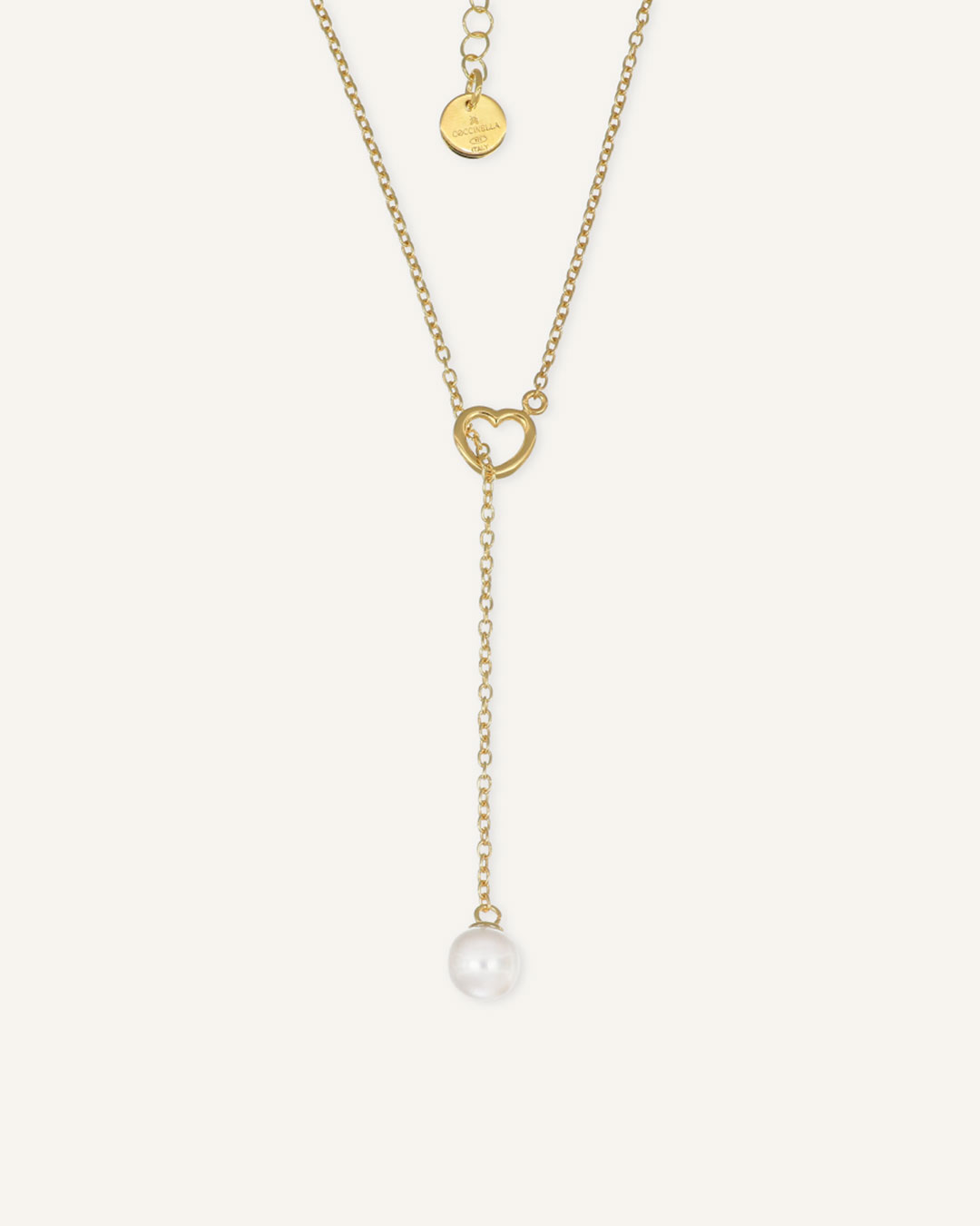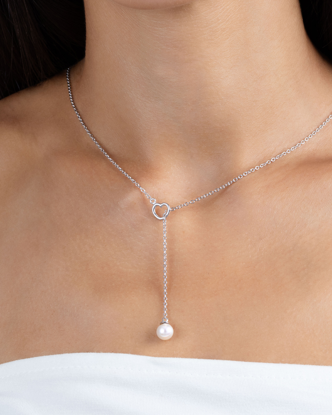 Ogrlica sa srcem kroz koji prolazi viseći biser simbolizuje ljubav i eleganciju, savršena za posebne trenutke. Idealna kao poklon, ova ogrlica unosi sofisticiranost i sentimentalnu vrednost u svaki dar.
