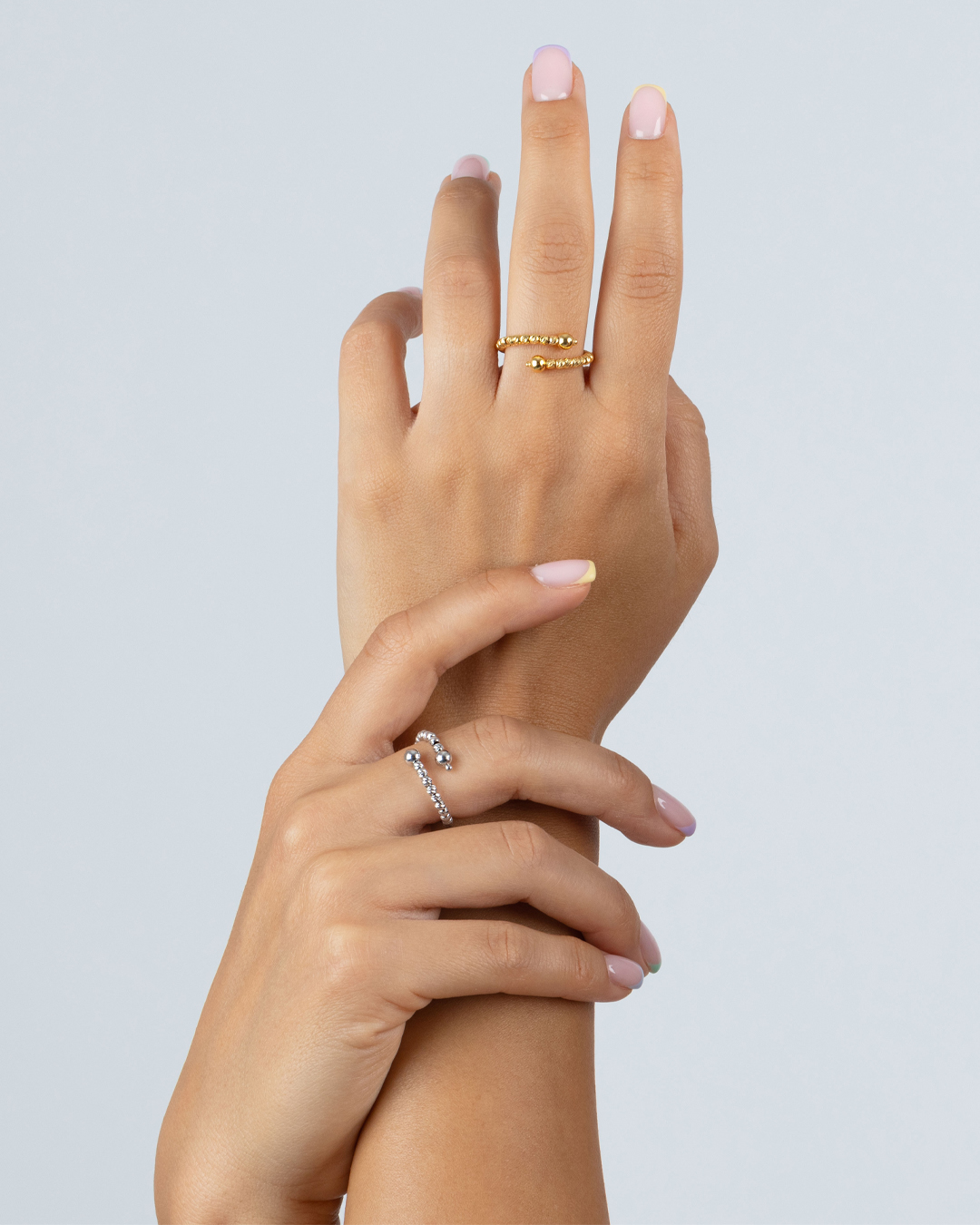 Otvoreni prsten izrađen od presijavajućih kuglica odiše jedinstvenim dizajnom i blistavim efektom, savršenim za isticanje svakog stila.