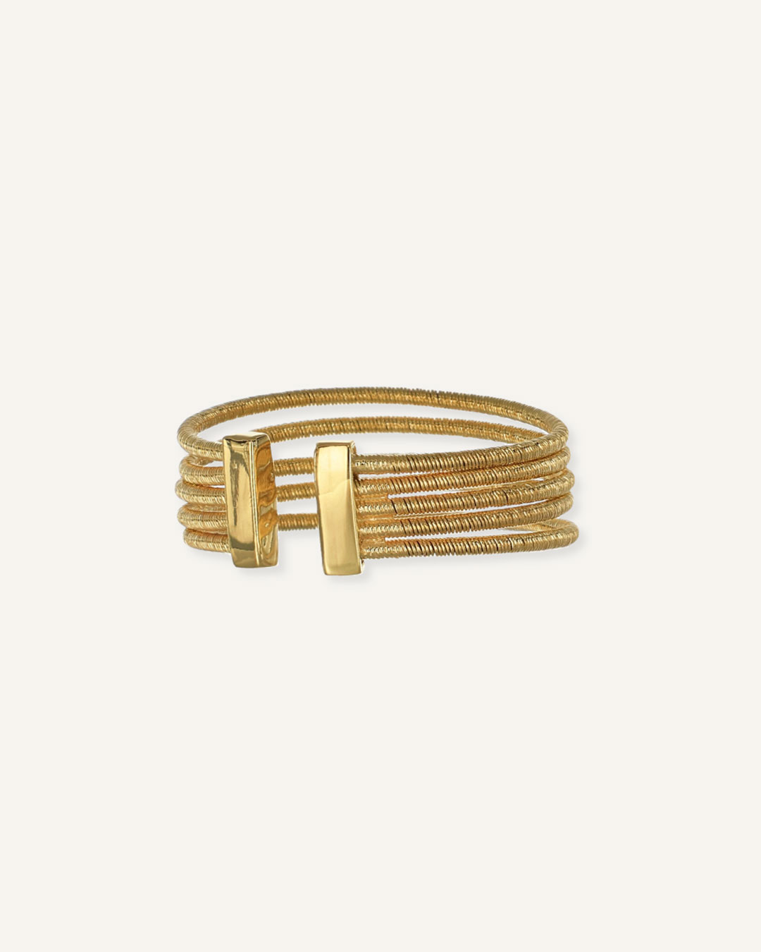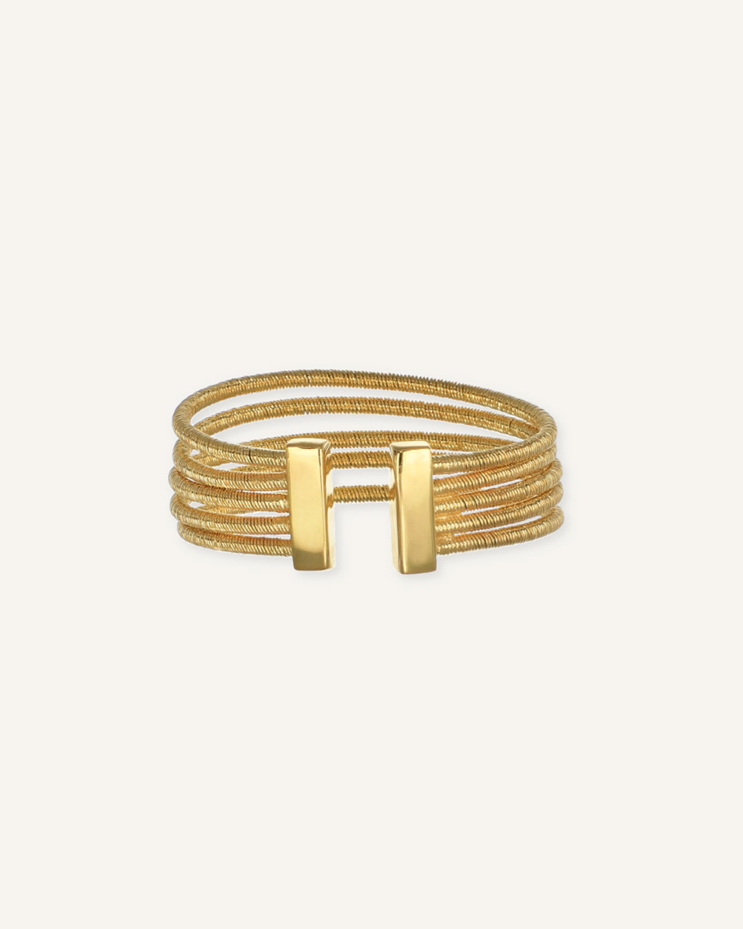 Prsten od spiralnih niti elegantnog dizajna s glatkim sjajem. Središnji dio prstena ukrašen je minimalističkim elementom koji povezuje niti i daje sofisticirani izgled.