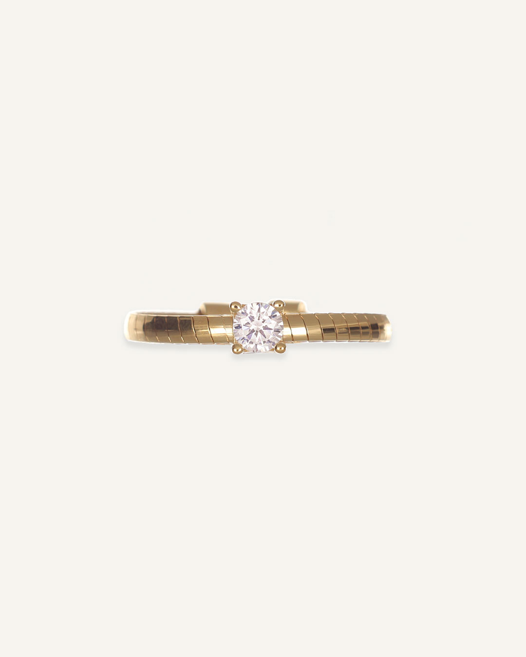 Ovaj minimalistički prsten talijanskog dizajna krasi blistavi kamen koji naglašava njegovu eleganciju i profinjenost. Njegov jednostavan, ali upečatljiv izgled čini ga savršenim dodatkom za svakodnevno nošenje ili posebne prilike.