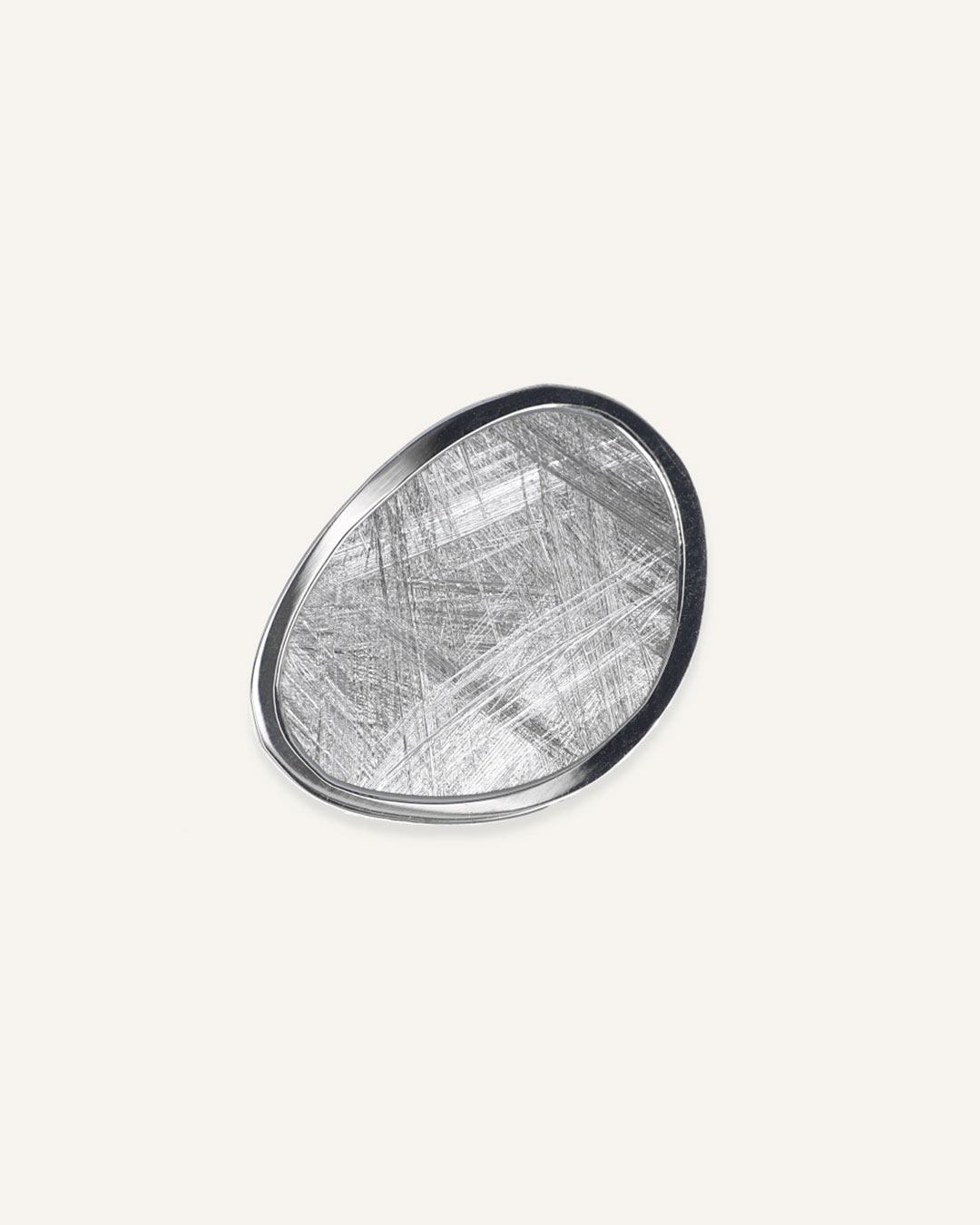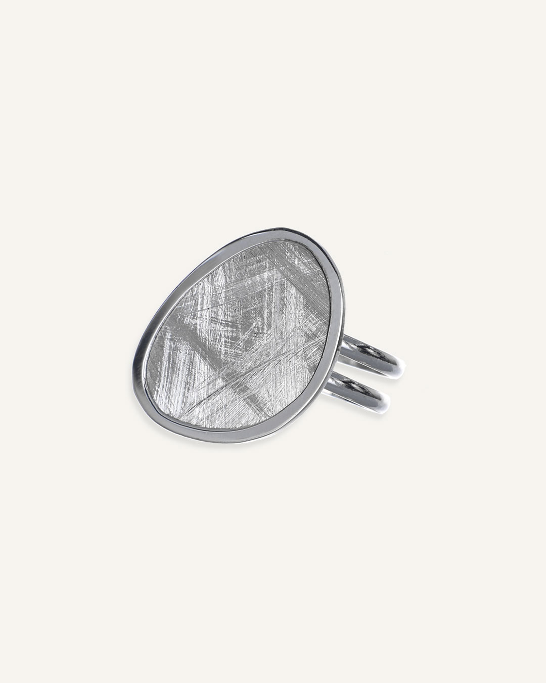 Prsten ima moderan i upečatljiv dizajn s asimetričnim elementom u obliku nepravilnog trokuta, ukrašen teksturom koja podsjeća na gravure. Povezan je s trostrukom tankom trakom koja mu daje elegantan i sofisticiran izgled.